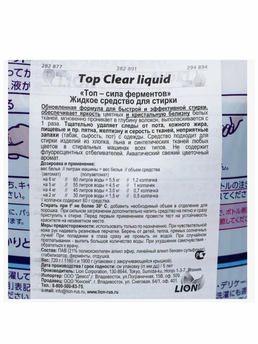 Lion top clear liquid жидкое средство для стирки белья, сила ферментов, 900 мл