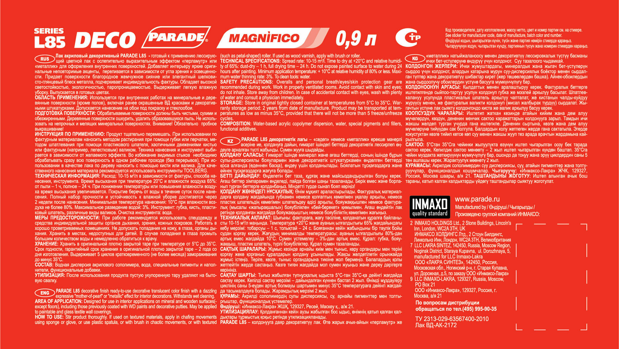 Декоративный лак PARADE DECO Magnifico L85 Жемчуг 0,9л Россия