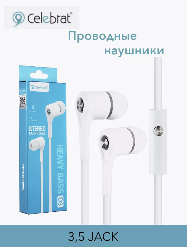 Купить Наушники Celebrat D3 с проводом и микрофоном, белые