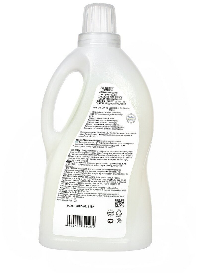 Купить Гель MOLECOLA для стирки цветного и линяющего белья экологичный 1500 мл