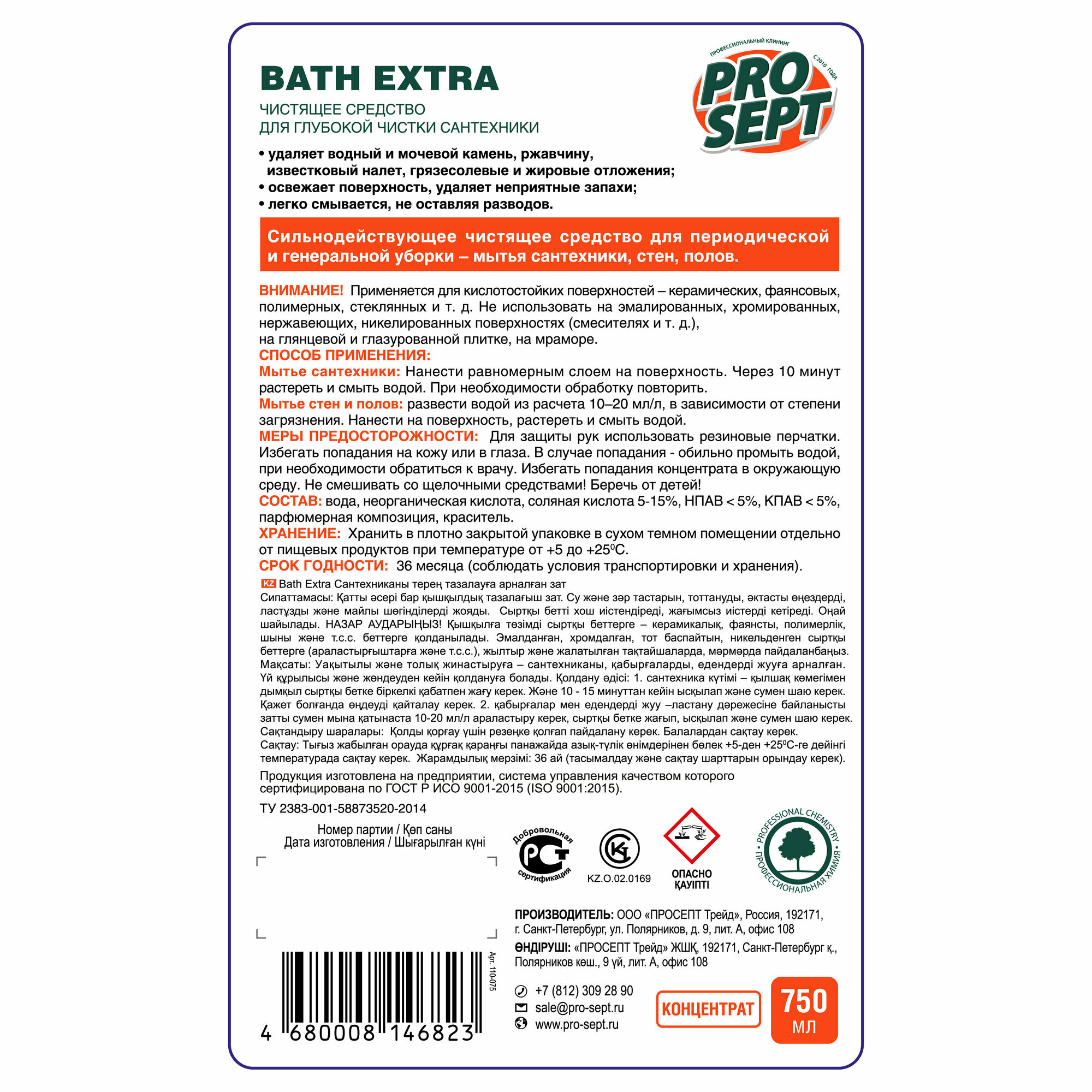 Средство для глубокой чистки сантехники. Концентрат ( Bath Extra 0,75 л Prosept 110-075 )