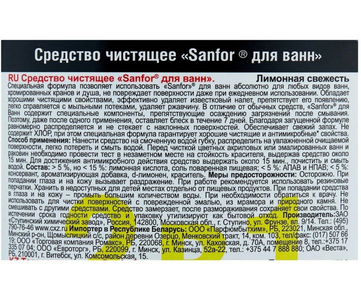 Ступинский химический завод (СХЗ) Средство для чистки ванн Sanfor Лимонная свежесть 750 мл
