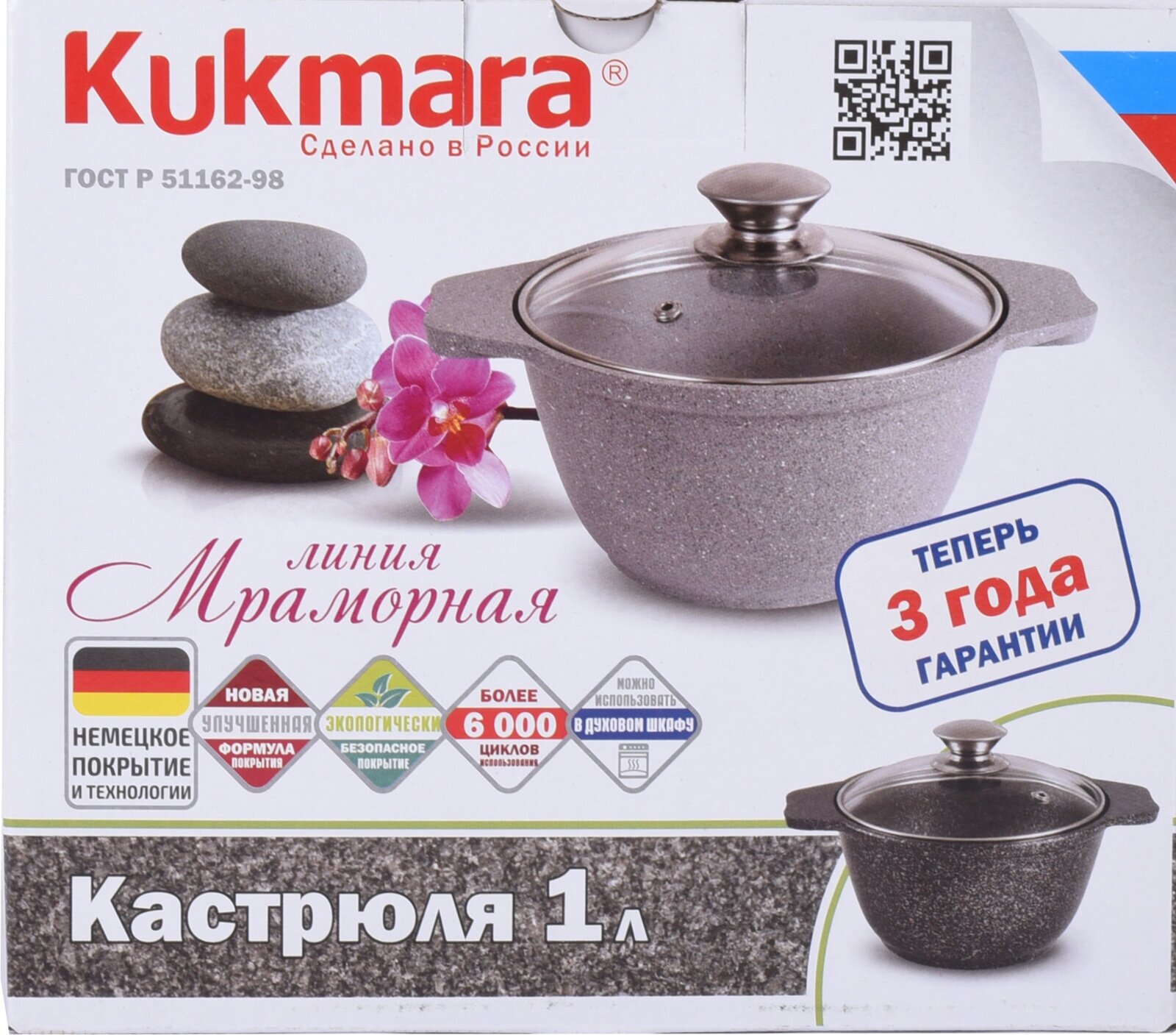 Купить Кастрюля Kukmara "Мраморная" 1л с антипригарным покрытием (темный мрамор) со стеклянной крышкой