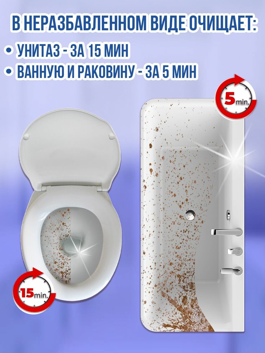 | Плюсы: | 1. Очень хорошая очистка. В запущенном случае можно залить в унитаз на ночь и утром смыть.