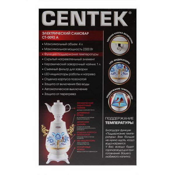 Самовар Centek CT-0092 A (белый+рисунок+золото), 4.0л, 2300Вт, поддерж.t + LED индикатор, керам зав.