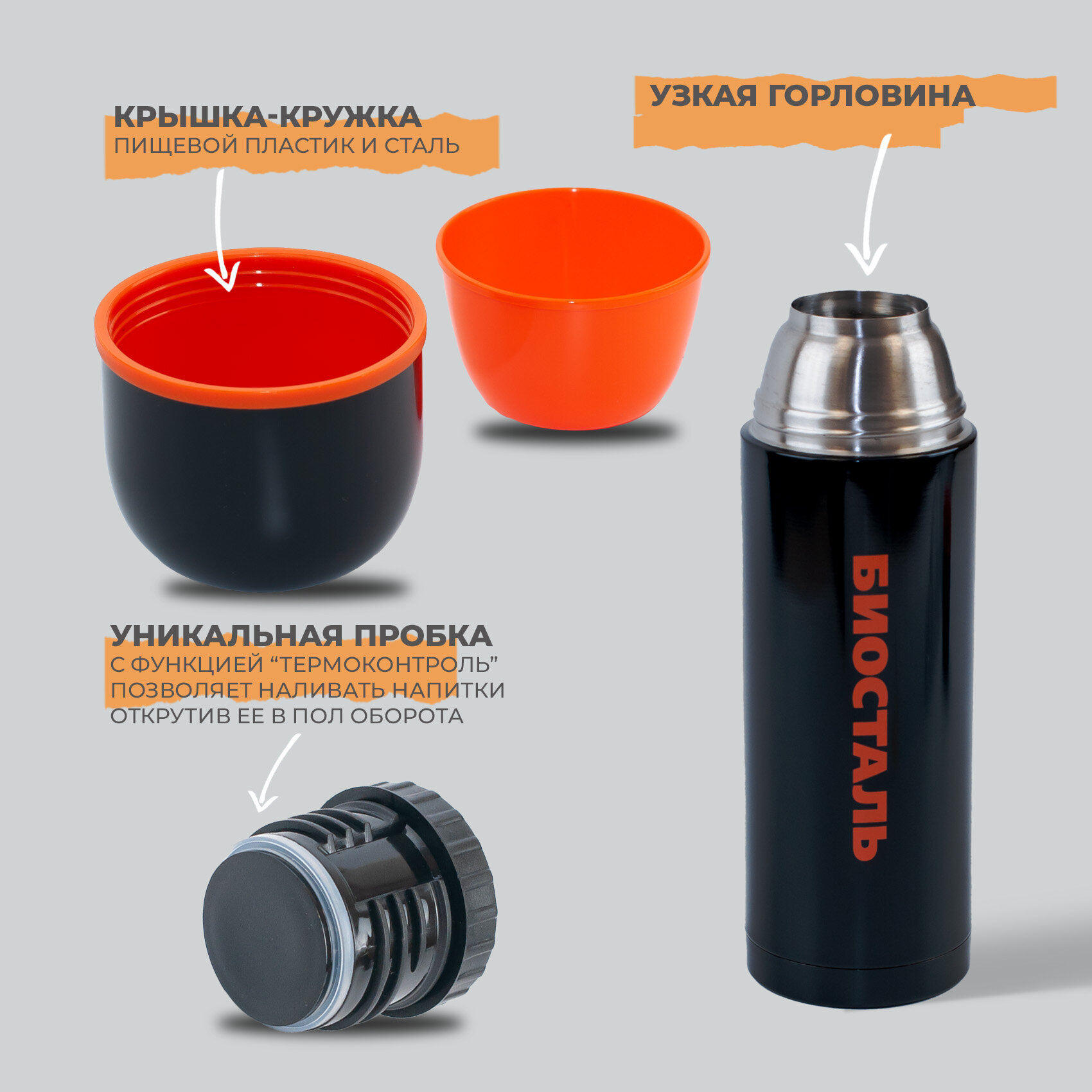 Термос BIOSTAL 500NBP-С черный с узкой горловиной, объем 0,5л