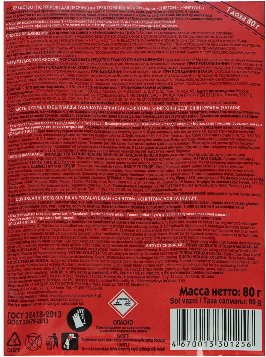 Порошок для прочистки канализационных труб гранулы в Горячей водой 80гр чиртон