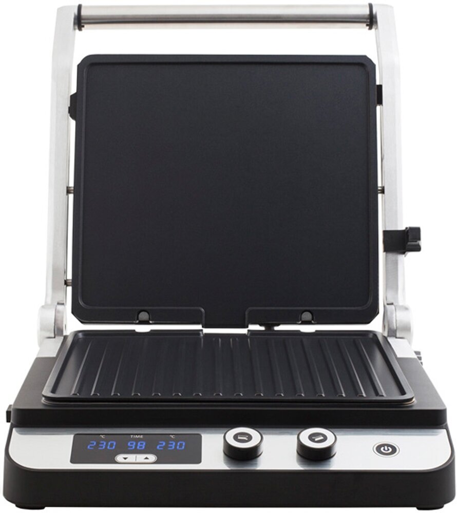 2. Две съемные поверхности, которые легко очищаются. 3. Открывается на 180 градусов. 4. Простота в использовании. 5. Таймер. 6. Есть поддон для слива жидкости и жира. |
