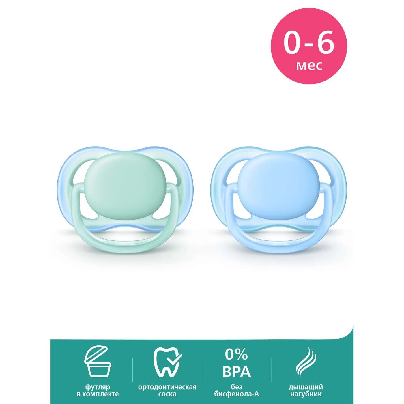 Ultra Air 0-6 мес. 2 шт. с футляром для хранения и стерилизации Голубой/Зеленый