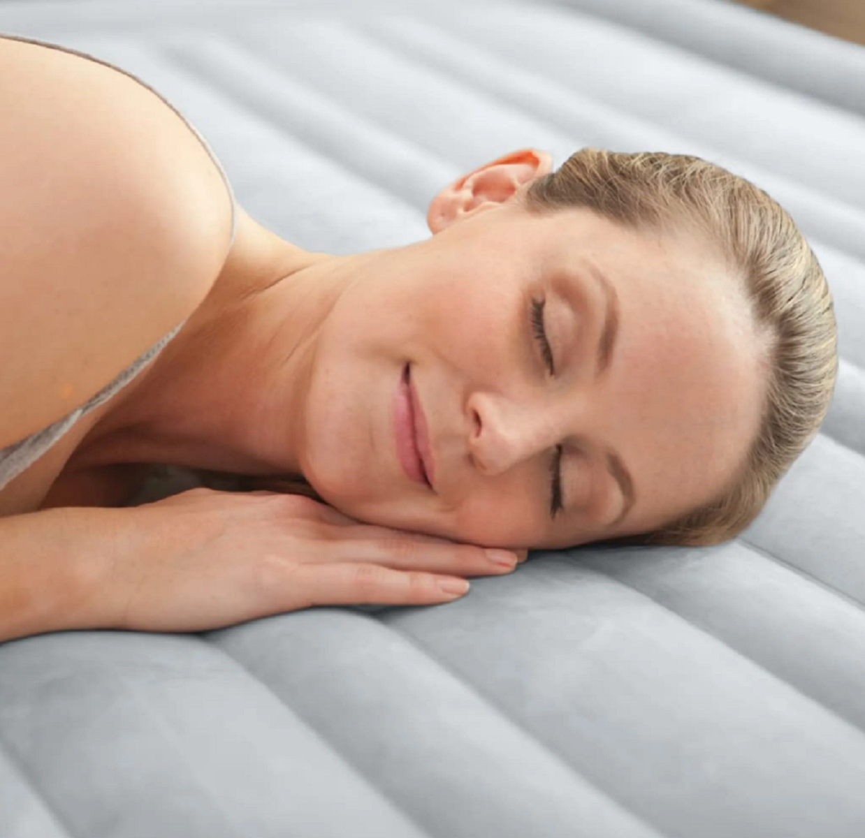 В надутом состоянии очень легко передвинуть на другое место. Рельеф кровати без глубоких выпуклостей и располагается перпендикулярно позвоночнику, поэтому спиной "бороздок" не ощущается. Антискользящее покрытие. Насос шумный, но зверский - надувает за пару минут. Есть клапан, которым можно подрегулировать объем воздуха, если перекачали. Прилагается сумка, чтобы после сдутия свернуть и убрать. В свернутом состоянии не занимает много места. Вес ок. 7 кг. Внешне кровать смотрится симпатично. Для гостей на неделю вполне приемлемый вариант. |