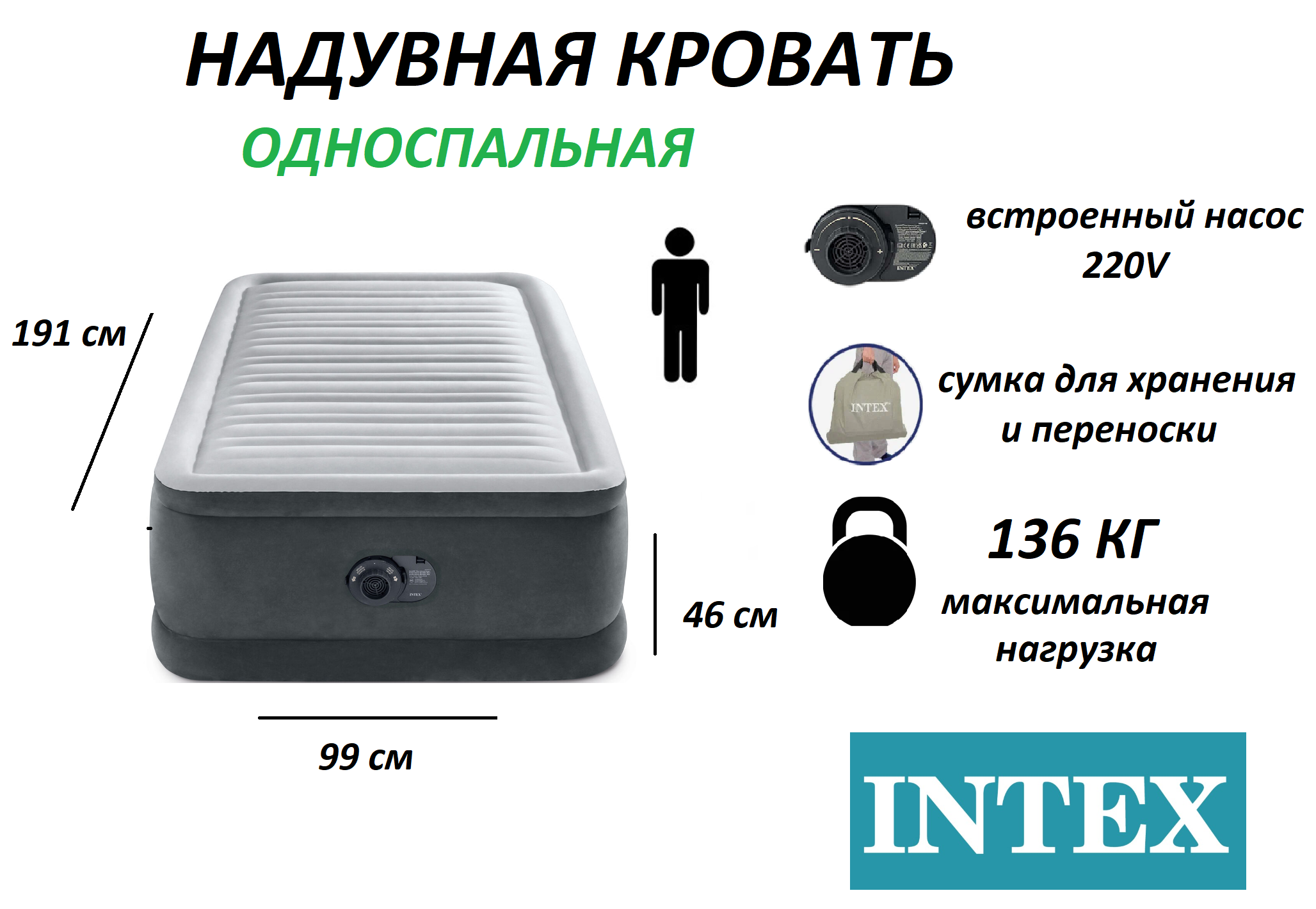 Купить Надувная одноместная кровать Intex 99 x 191 x 46 см со встроенным насосом