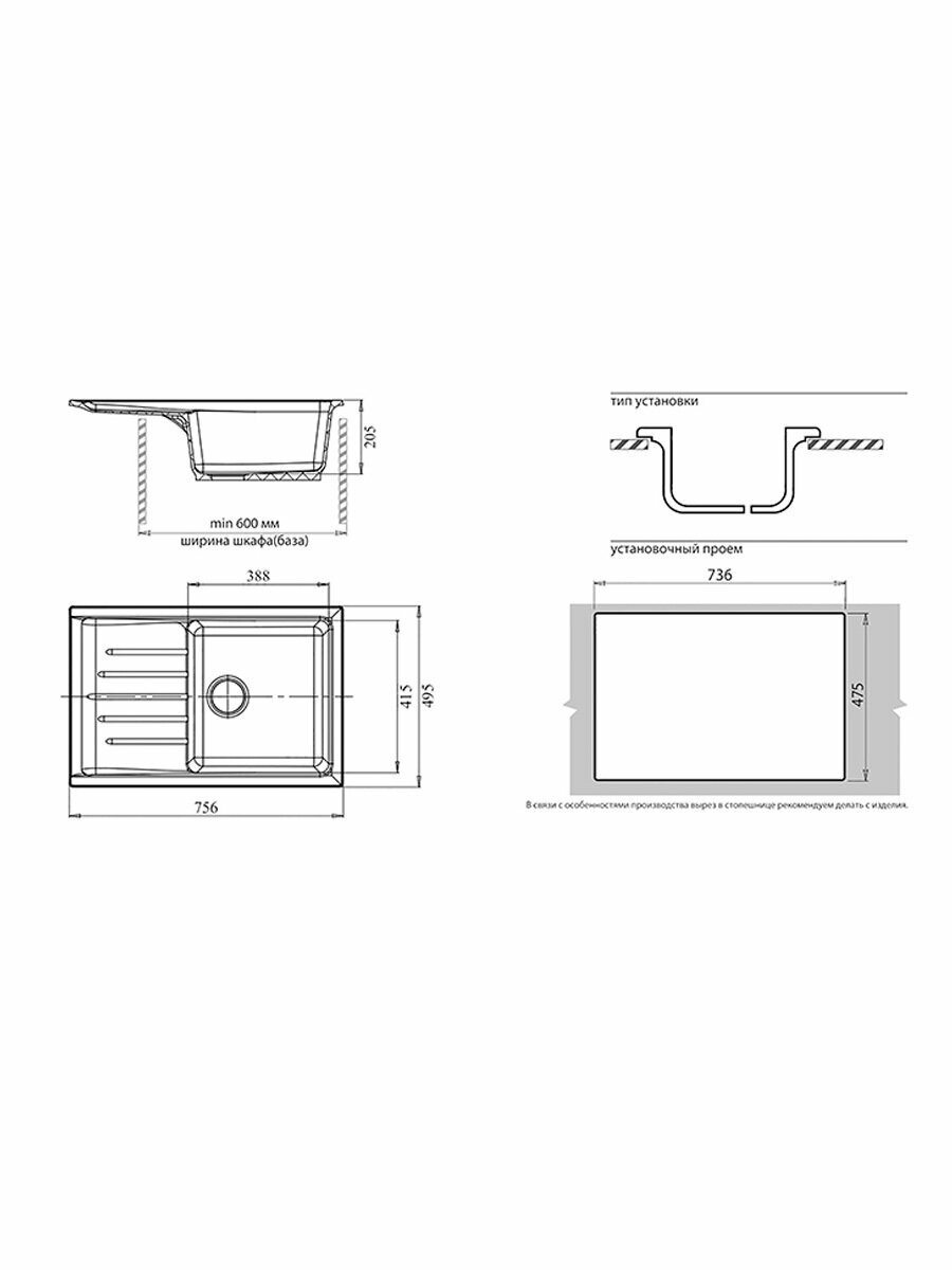 Кухонная мойка GranFest PRACTIK 760L, 1 чаша+крыло,756*495 мм, (P-760L топаз)