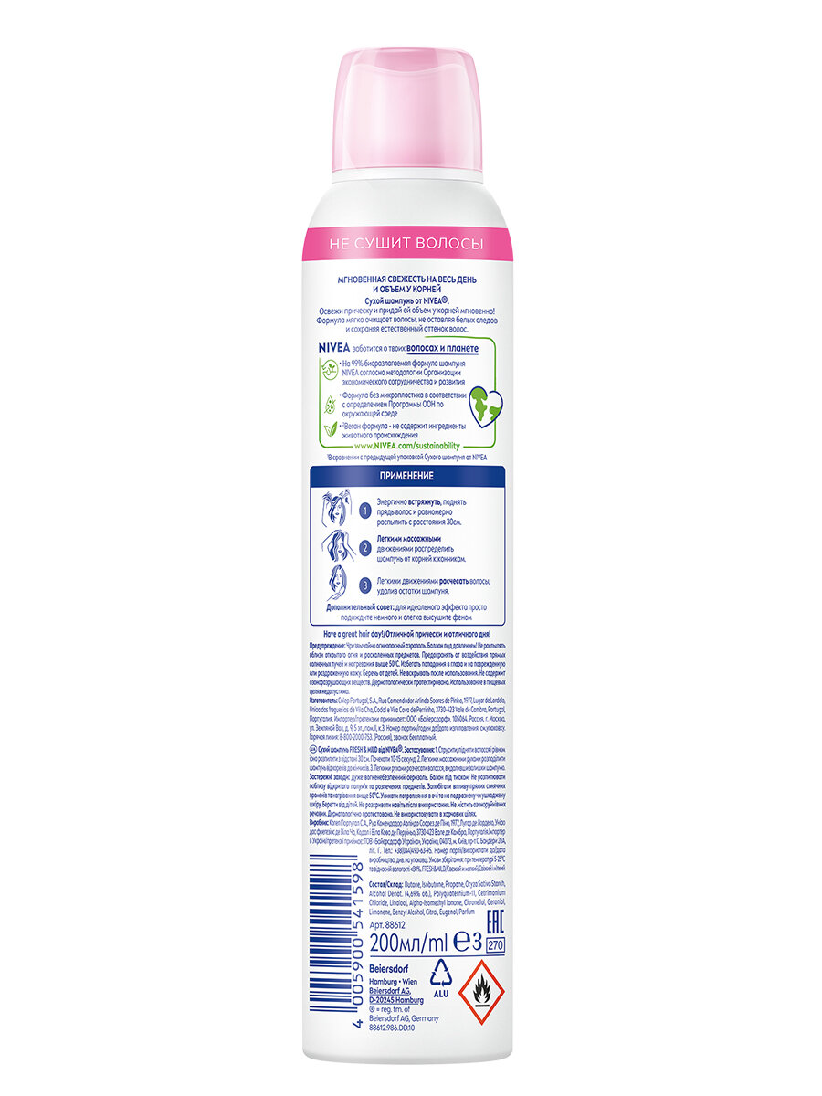 | Способ применения | энергично встряхнуть, поднять прядь волос и равномерно распылить с расстояния 30 см. Легкими массажными движениями распределить шампунь от корней к кончикам и расчесать волосы, удалив остатки шампуня |