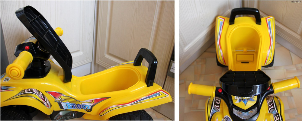 | Плюсы: | Отличный квадрик. Малышу очень нравится. Качественный пластик, громкая музыка. Сиденье откидывается, можно с собой на прогулку взять бутылку с водой ещё и небольшие игрушки влезут. Товаром довольны. Спасибо. |