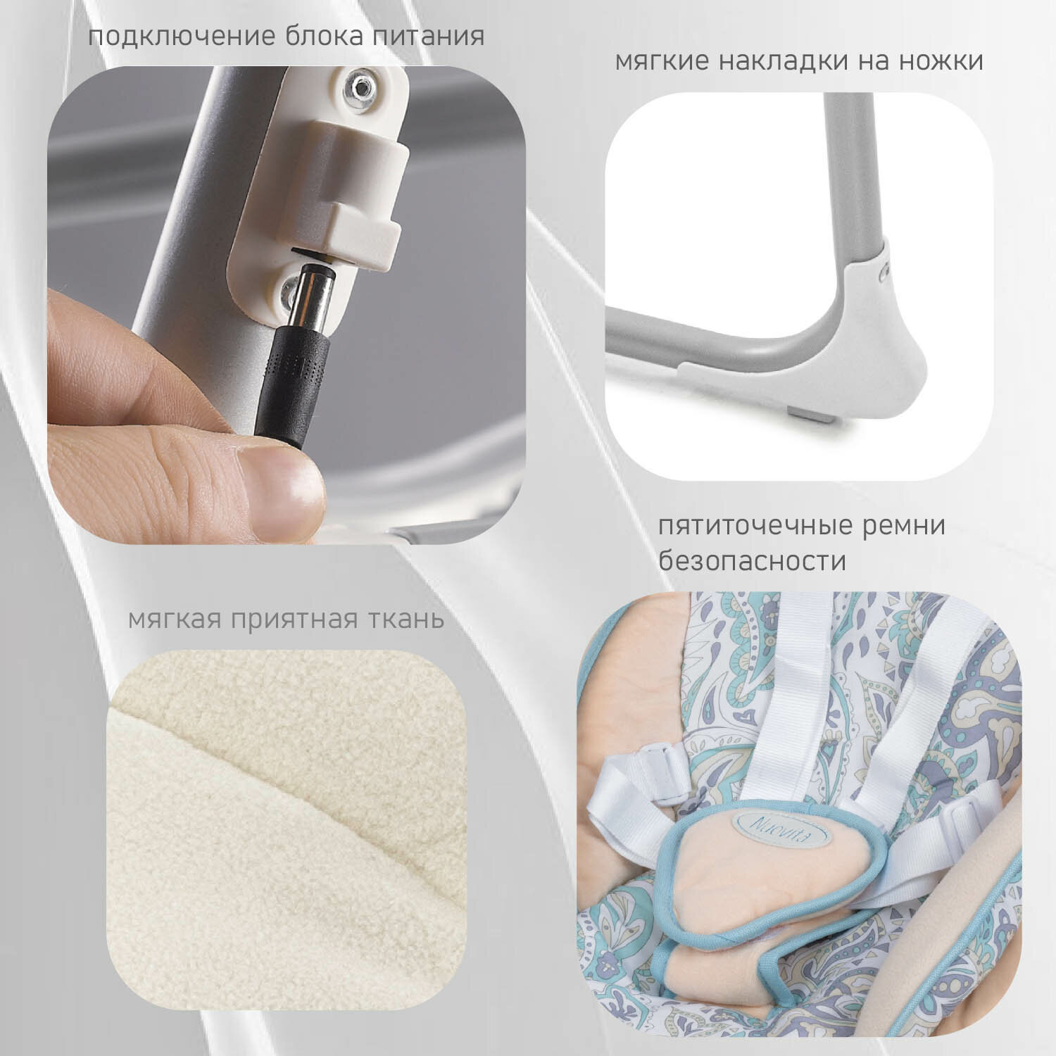 | Плюсы: | Отличные качели, бесшумные, качественные, ребенок засыпает |