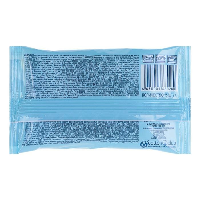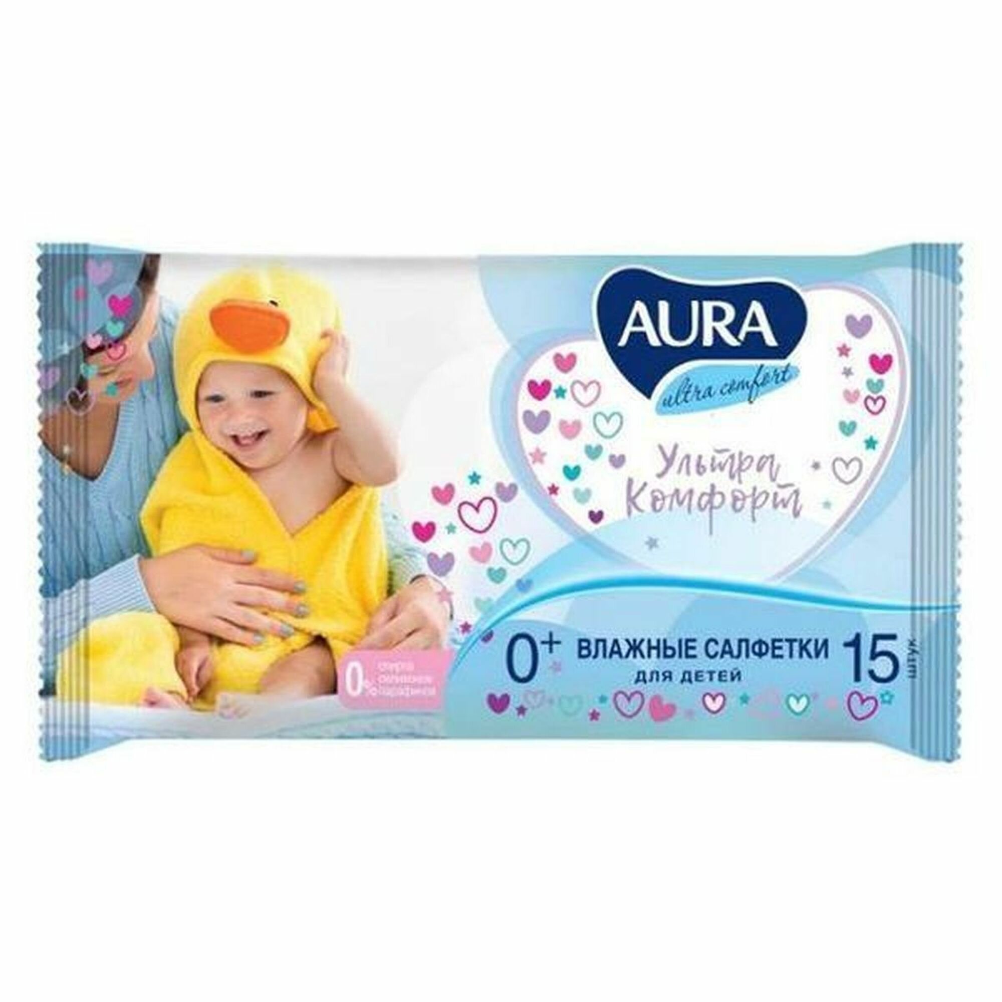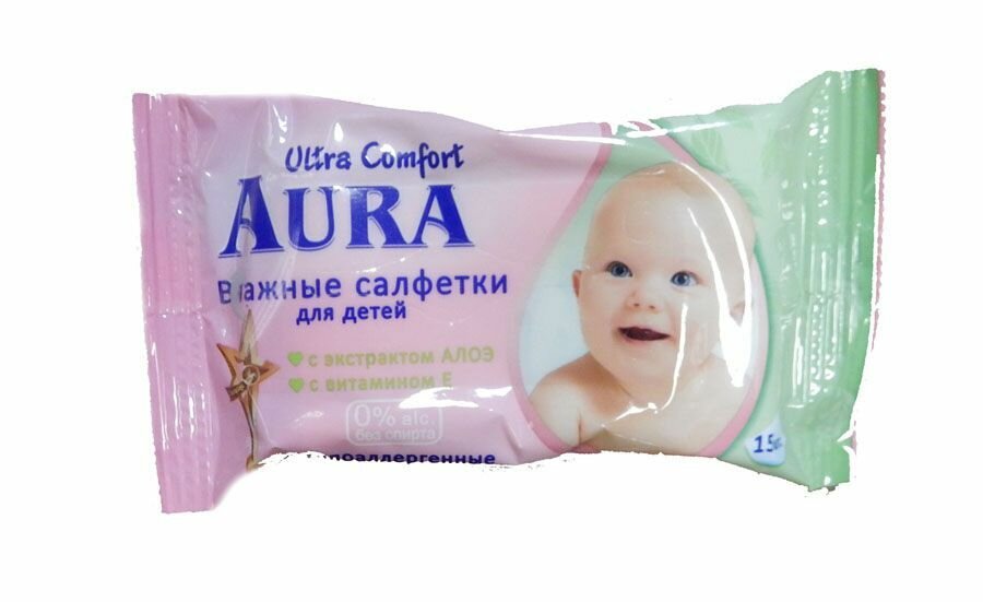 Салфетки влажные Aura "Ultra comfort", 15шт., детские, универсал. очищающие, без спирта