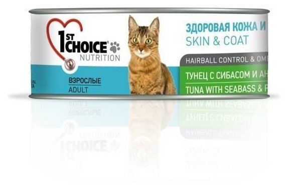 Влажный корм для кошек 1st Choice для здоровья кожи и блеска шерсти, для вывода шерсти, с тунцом, с сибасом, с ананасом 12 шт. х 85 г (кусочки в соусе)