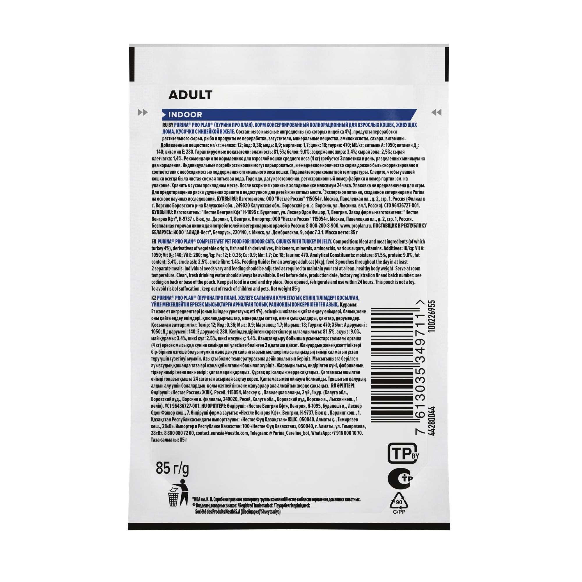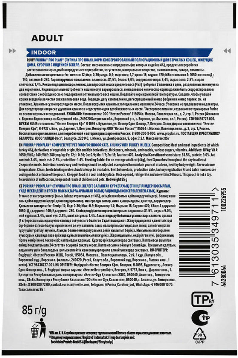 Влажный корм PRO PLAN INDOOR для взрослых кошек, живущих дома, с индейкой в желе, 85 гр
