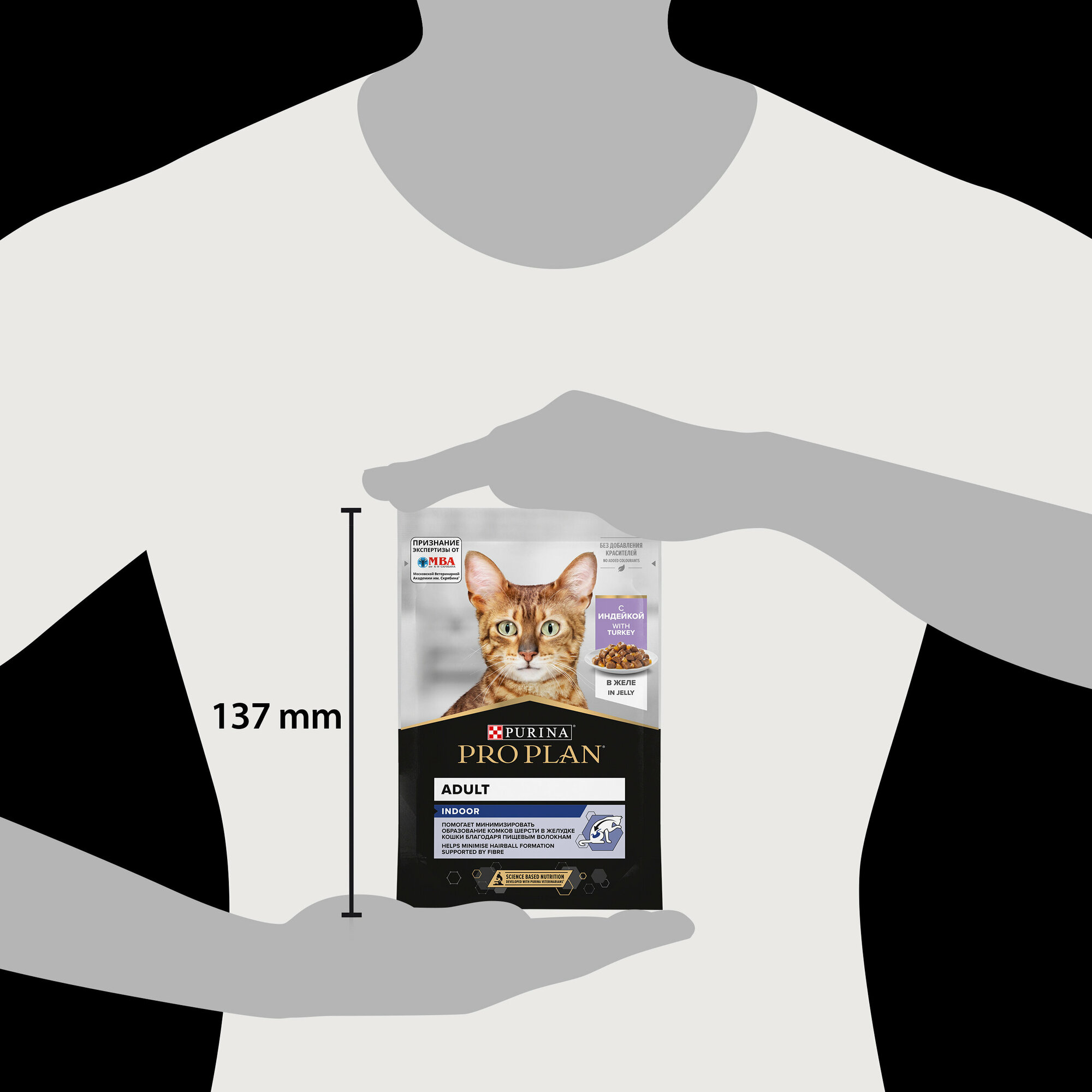 Кусочки индейки в пакетике примерно одинакового небольшого размера, коту есть удобно. Желе достаточное количество. |