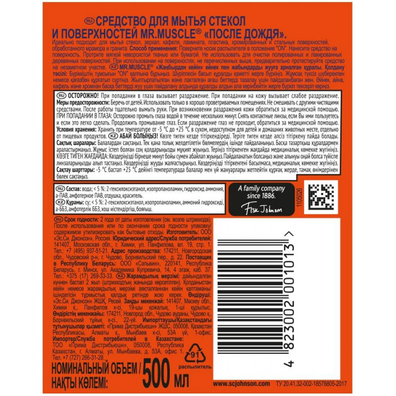 Средство для чистки стекла Средство для мытья стекол и зеркал 500 мл, мистер мускул "После дождя", распылитель