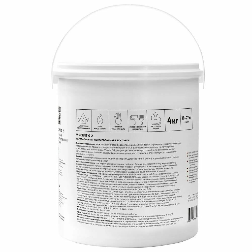 Грунт под Cтруктурные Покрытия Vincent G2 Structura Fix 4кг Полиакриловый, Белый / Винсент Г2 Структура Фикс