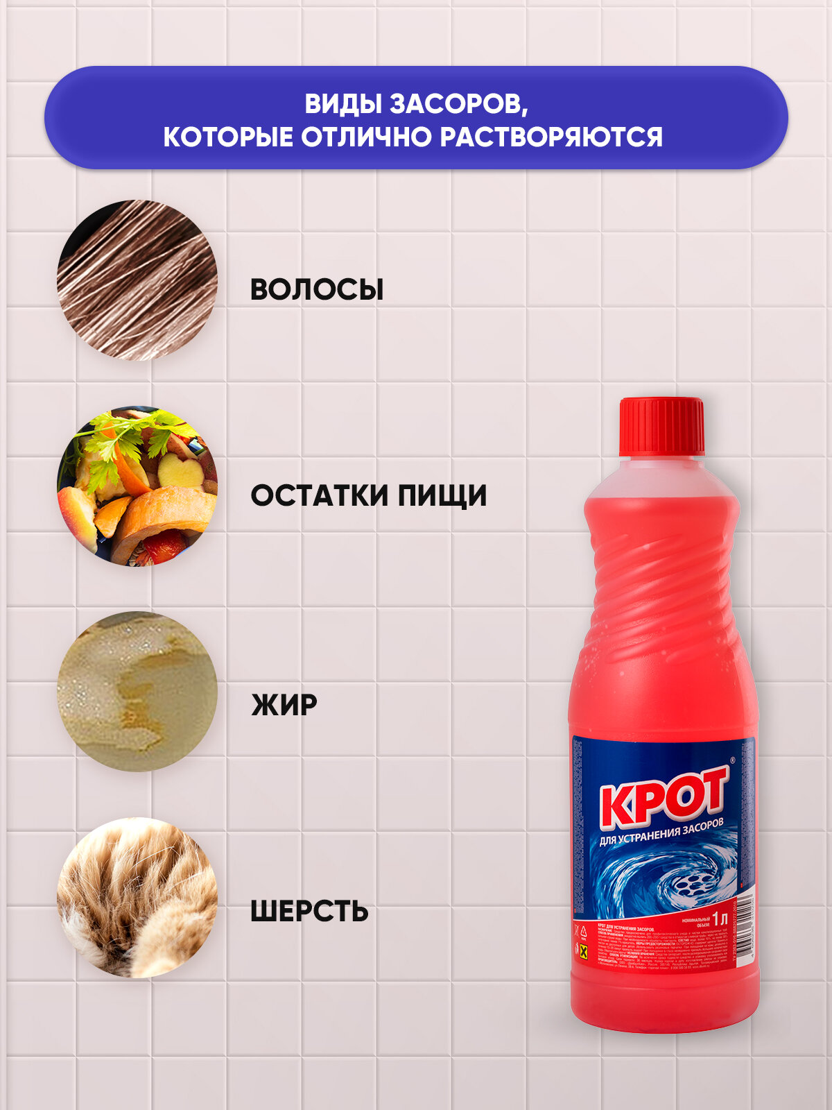 Крот "Для устранения засоров" 1 л, средство для прочистки труб, средство от засоров, средство от засора в трубах, прочистка труб, крот для труб