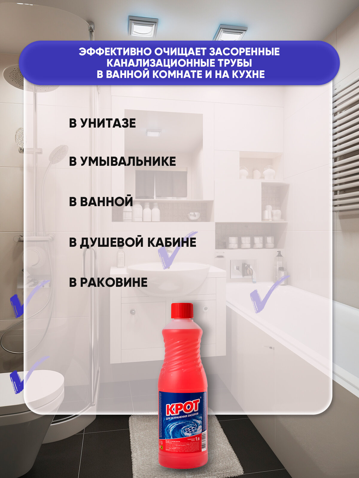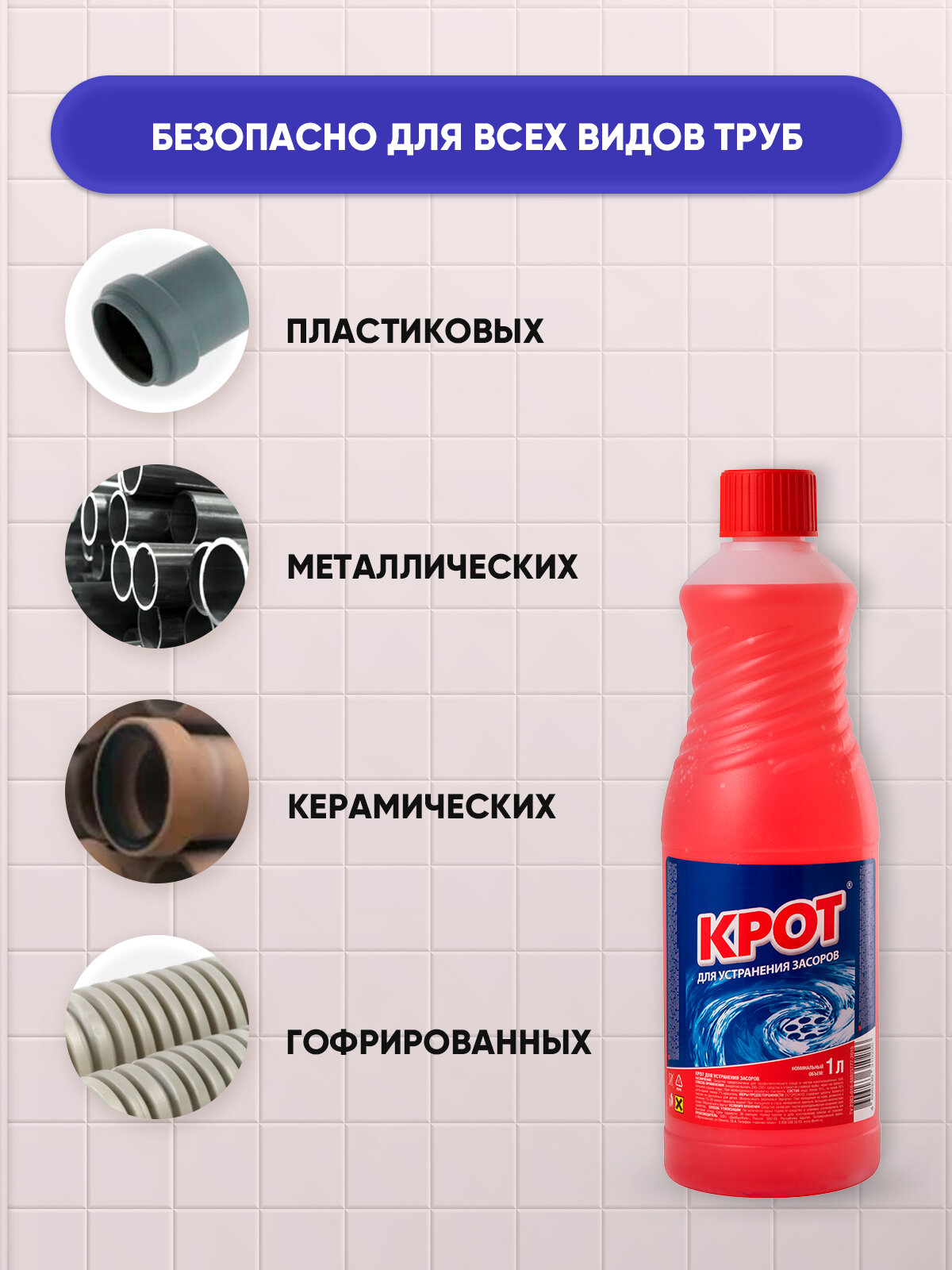 Крот Для устранения засоров 1 л, средство для прочистки труб, средство от засоров, средство от засора в трубах, прочистка труб, крот для труб