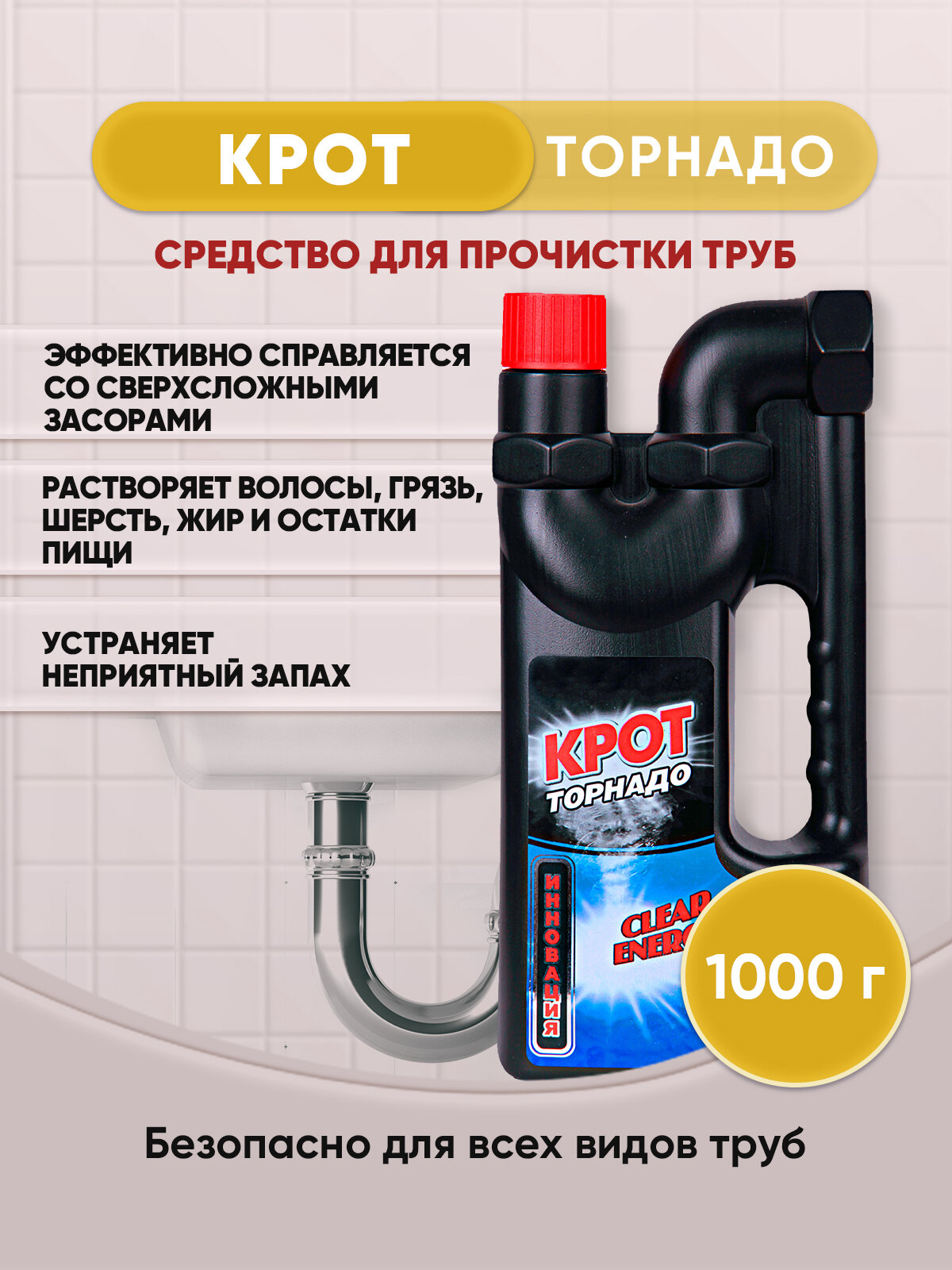 Крот Торнадо гель 1 л, средство для прочистки труб, средство от засоров, средство от засора в трубах, прочистка труб, крот для труб, очиститель труб