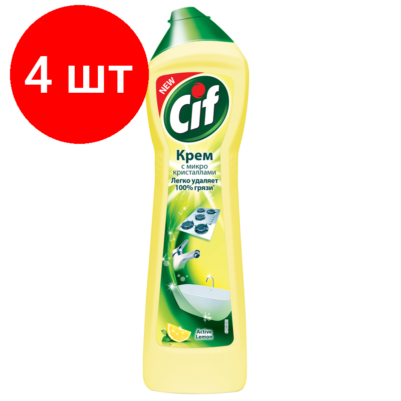 Купить Комплект 4 шт, Средство чистящее Cif "Active lemon", крем с микрокристаллами, 500мл