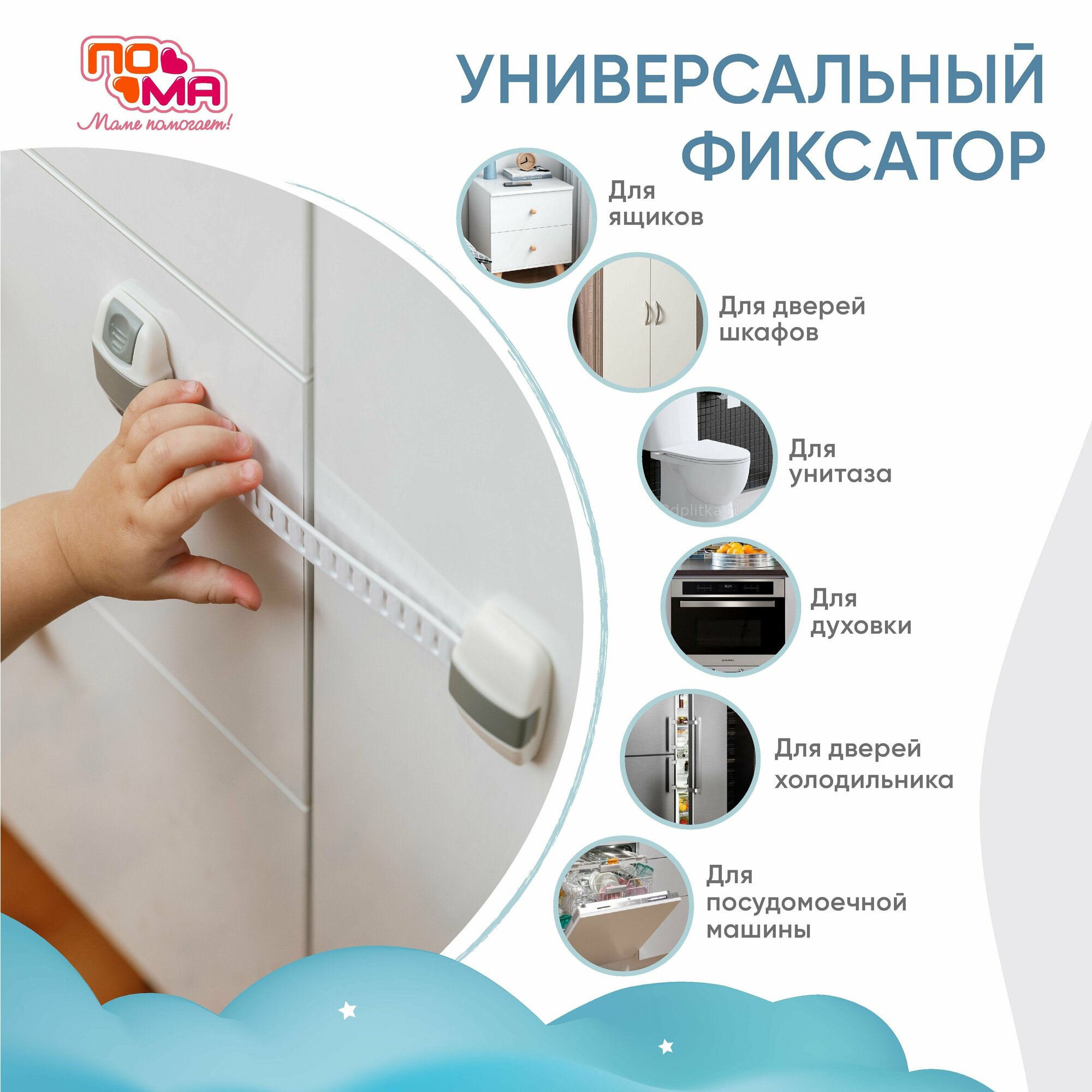 | Плюсы: | Ребенок не может понять, как открывается. Прочный,держится отлично ,есть запасная клейка основа,если надо переставить в другое место. |