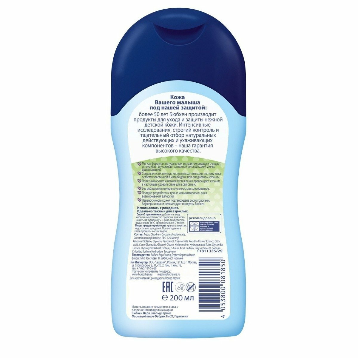 Мне очень нравится это средство и малышу тоже. После ванной становится спокойней и быстро засыпает. Я его рекомендую! Мягкое и деликатное средство для купания на растительной основе, стабилизирует естественную кислотную мантию кожи. Оно уменьшает покраснения и поддерживает ее природную защитную функцию. Содержит различные увлажняющие компоненты для оптимального ухода за нежной детской кожей. Содержит комплекс "БЮБХЕН-АКТИВНАЯ ЗАЩИТА КОЖИ", препятствующий избыточной потере влаге через кожу. Увлажняет кожу, благодаря натуральным активным компонентам ромашки, протеинам пшеницы, пантенолу и гелиотропину. Использовать с рождения. |