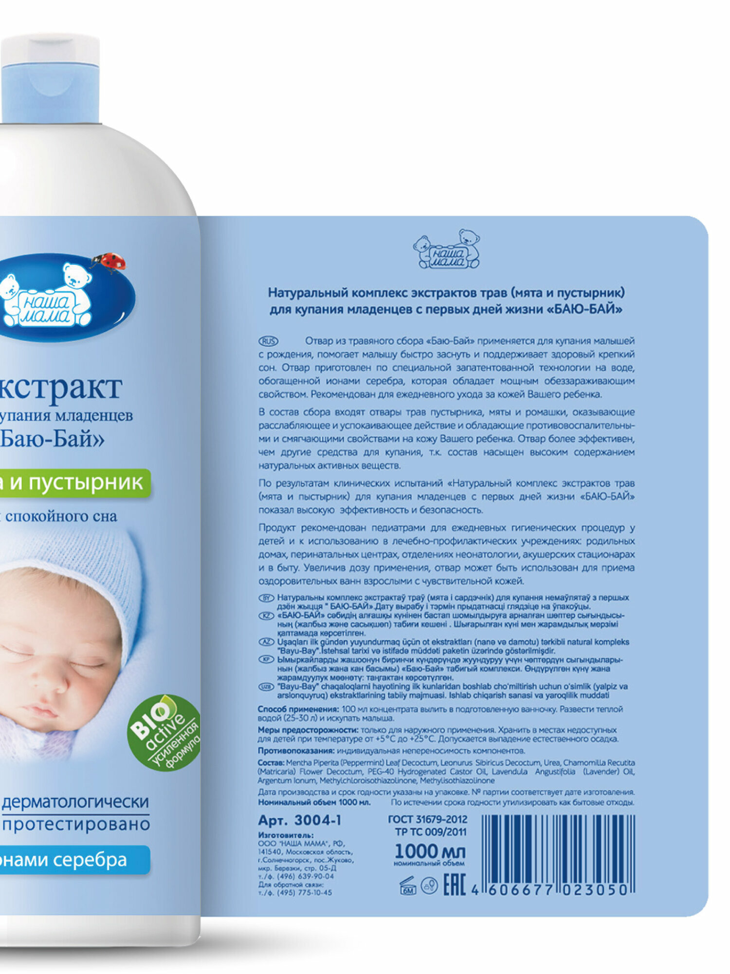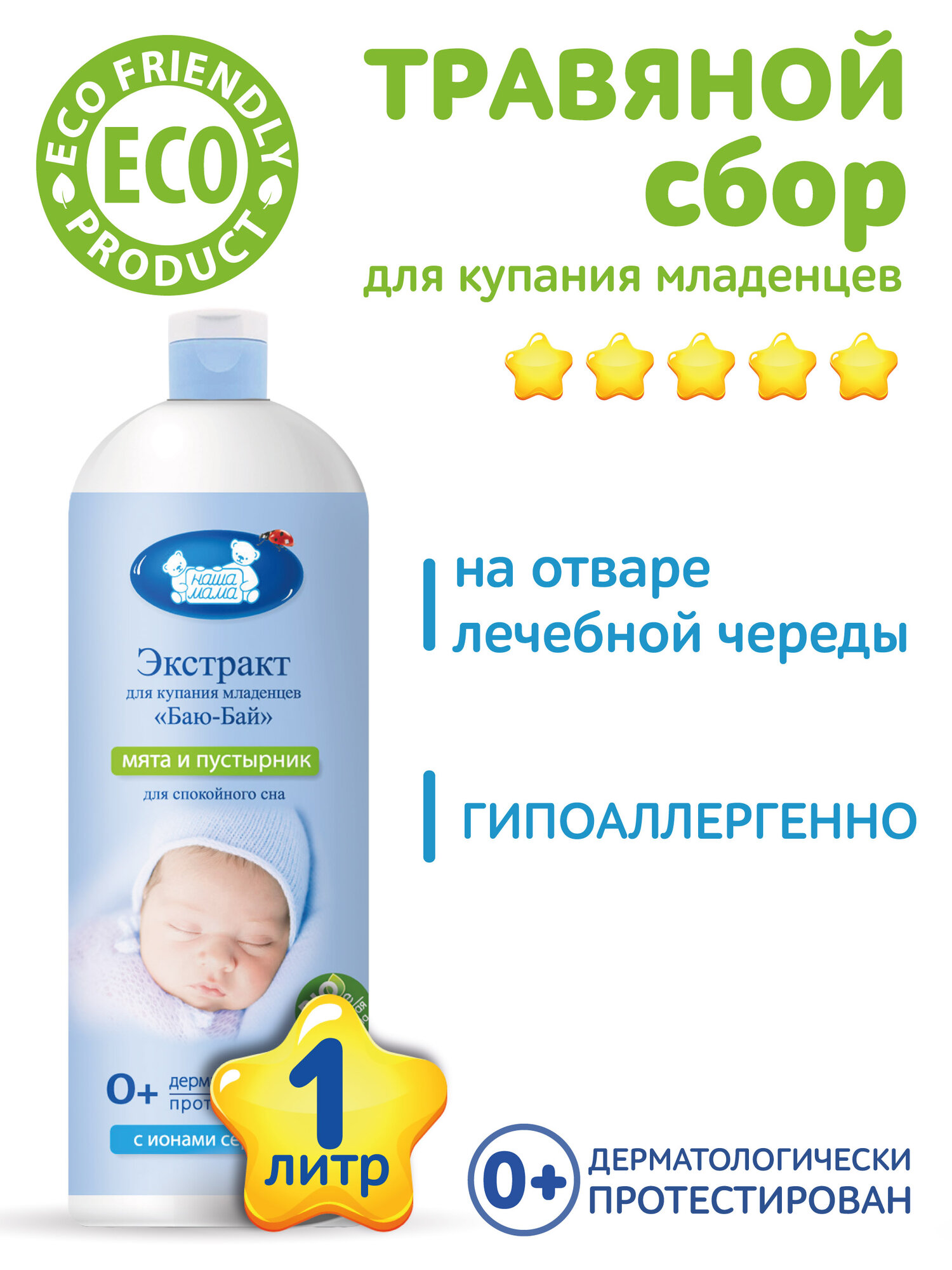 Комплекс экстрактов Наша Мама Баю-Бай, для купания младенцев с первых дней жизни, мята, пустырник 1000 мл