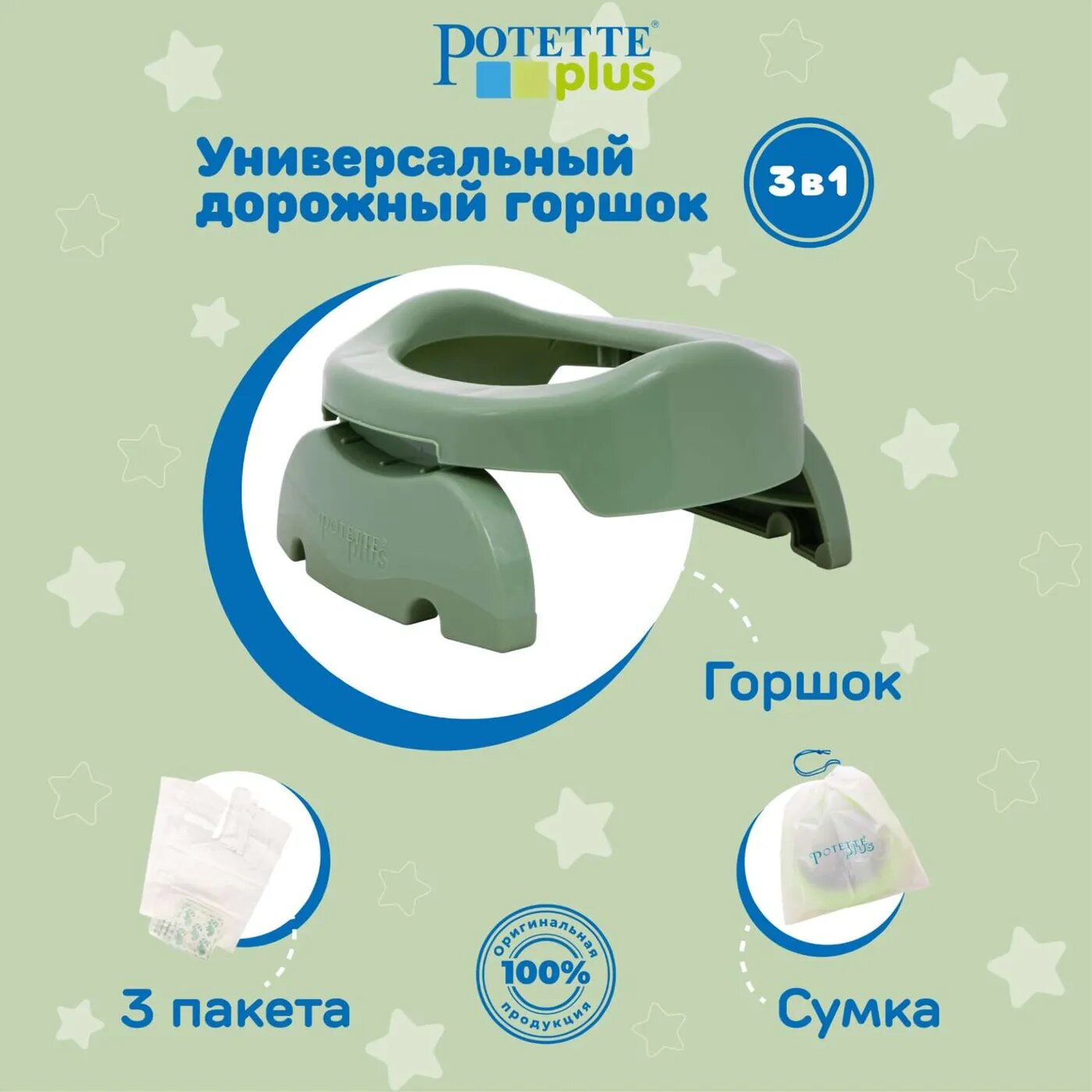 Купить Дорожный горшок Potette Plus складной + 3 одноразовых пакета оливковый