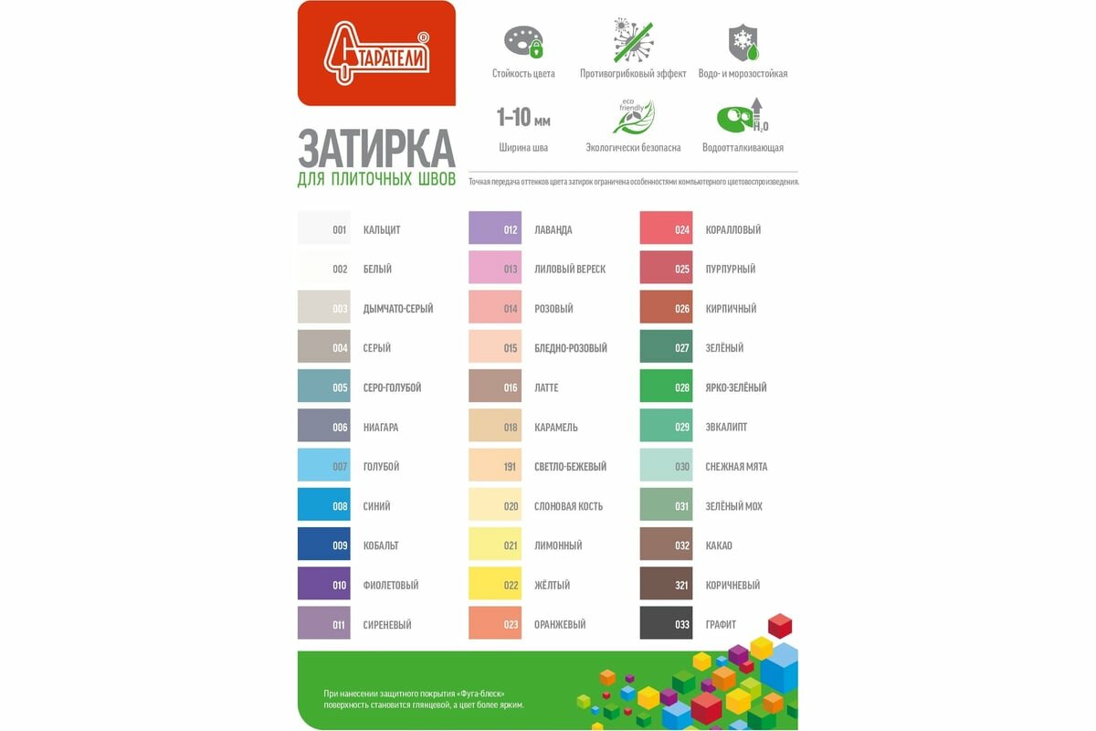 | Плюсы: | цена-качество! отличная затирка, большой выбор оттенков |