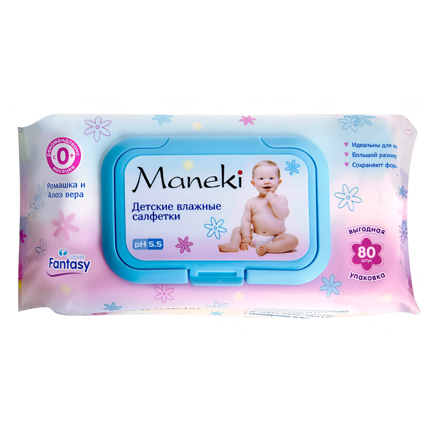 Maneki fantasy салфетки влажные, детские с экстрактом ромашки и алоэ вера, 80 шт.