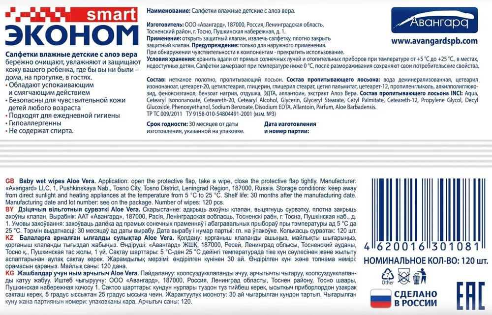 Влажные салфетки Эконом smart Детские с экстрактом алоэ вера, пластиковая крышка, 120 шт., 1 уп.