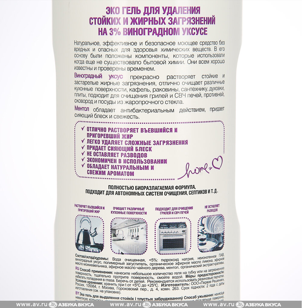 | Отзыв: | Когда на бутыли написано "Гель для удаления стойких и жирных загрязнений" то от него и ждёшь этих качеств. А средство с трудом смывает свежий жир с тарелки. Это обычное моющее средство среднего качества. И не знаю как насчёт уксуса, а ментола там точно нет. |