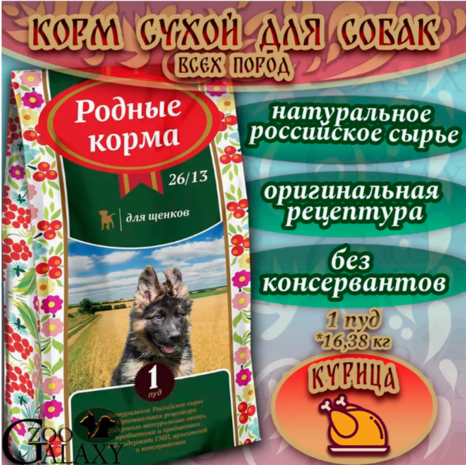СохранитьРодные корма сухой корм для щенков 26/13 1 Пуд (16,38 кг) интересное: