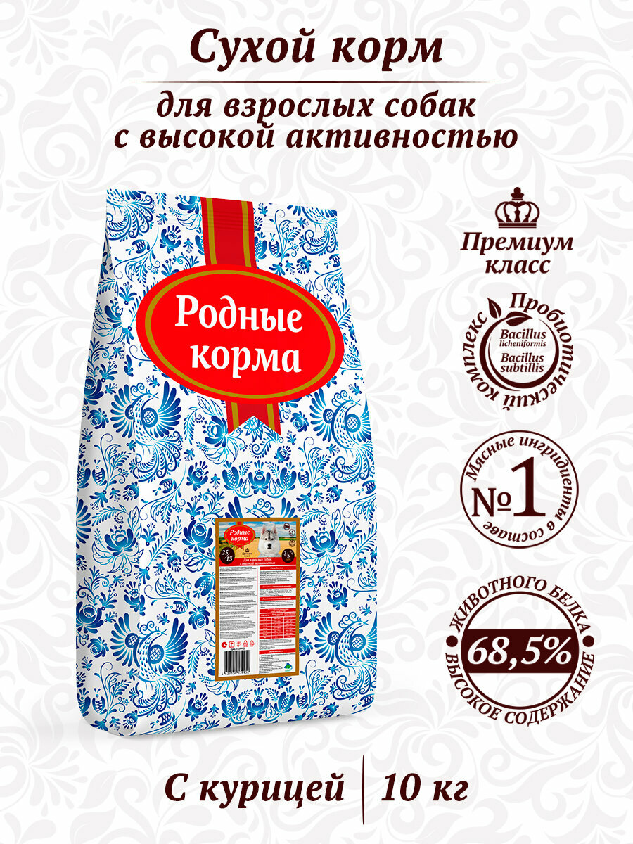 Родные Корма корм для взрослых собак всех пород, с высокой активностью, курица 10 кг