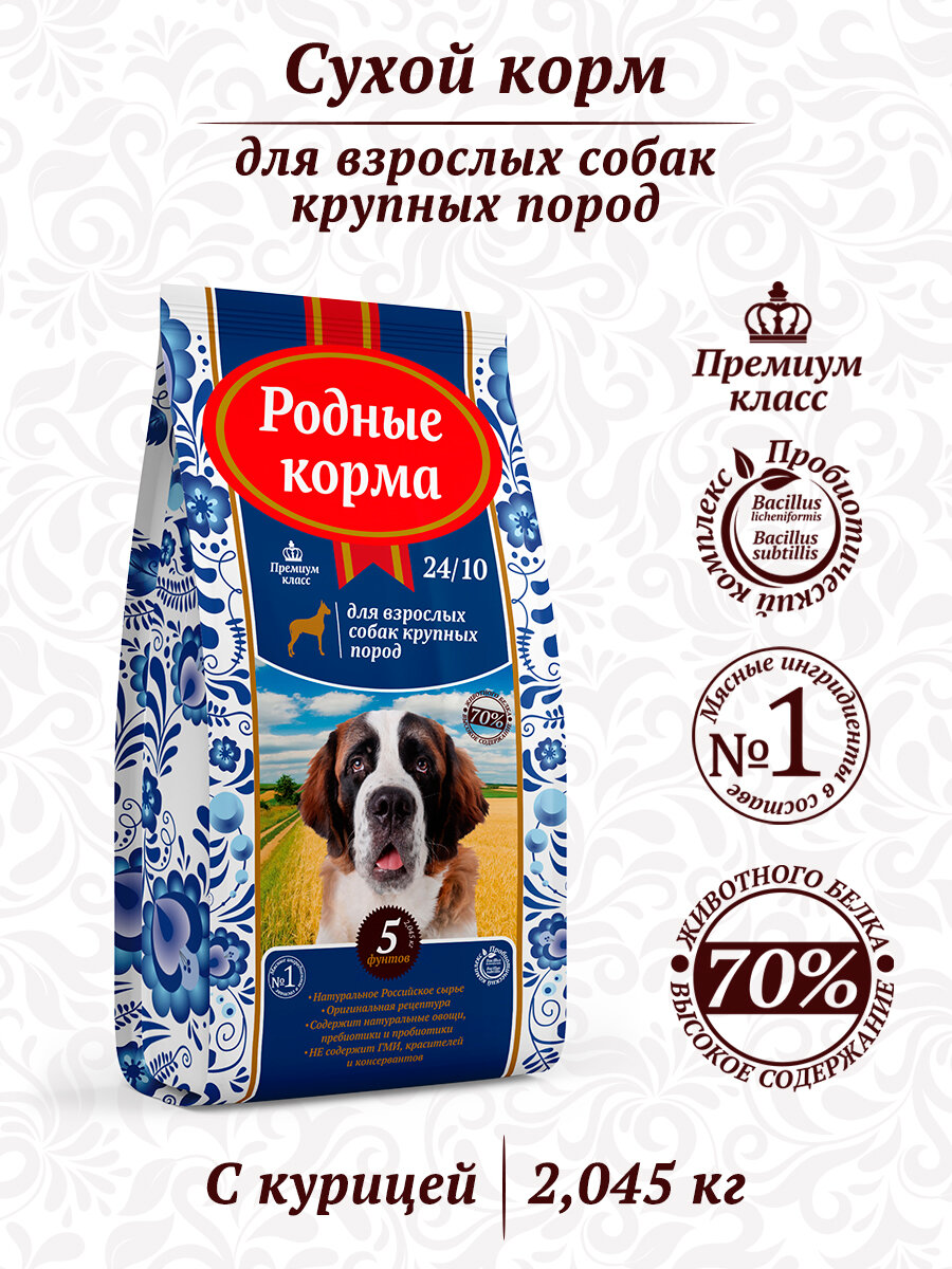 Корм для собак сухой Родные Корма для взрослых животных крупных пород гранулы с курицей 2.045кг / сбалансированное питание