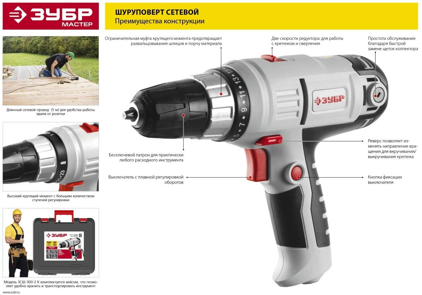 ЗУБР ЗСШ-300-2 К дрель-шуруповерт сетевая, 300 Вт, 0-400/0-1400 об/мин, в кейсе интересное: