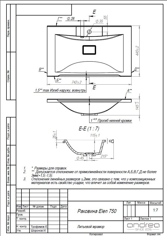 Раковина Andrea Elen 75 прямоугольная иск.мрамор интересное: