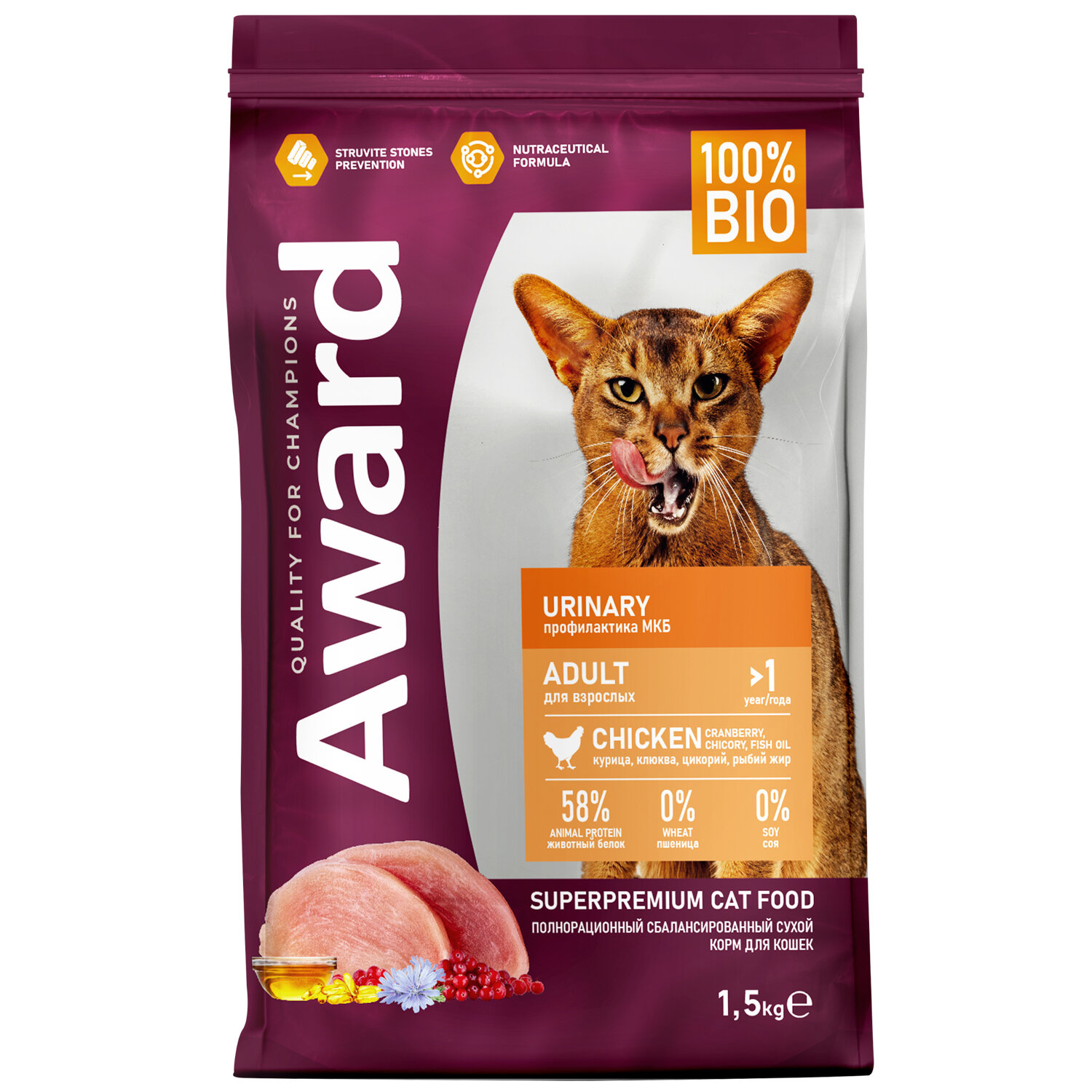 Купить Сухой корм AWARD Urinary для взрослых кошек для профилактики мочекаменной болезни с курицей с добавлением клюквы, цикория и рыбьего жира 1,5кг