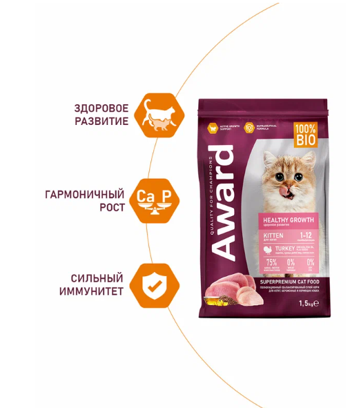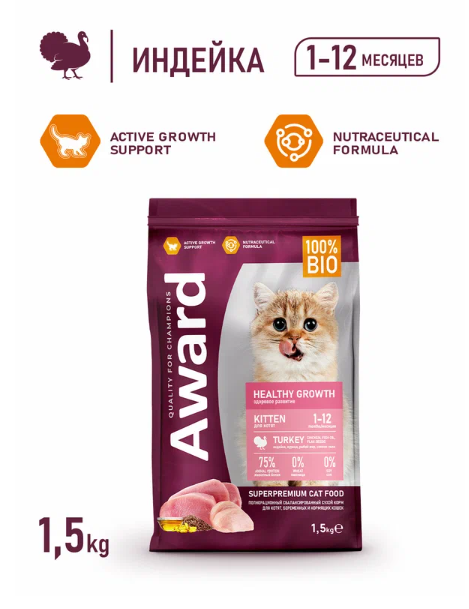 Купить Сухой корм AWARD Healthy growth для котят от 1 месяца, беременных и кормящих кошек с индейкой и курицей с добавлением рыбьего жира и семян льна 1,5кг