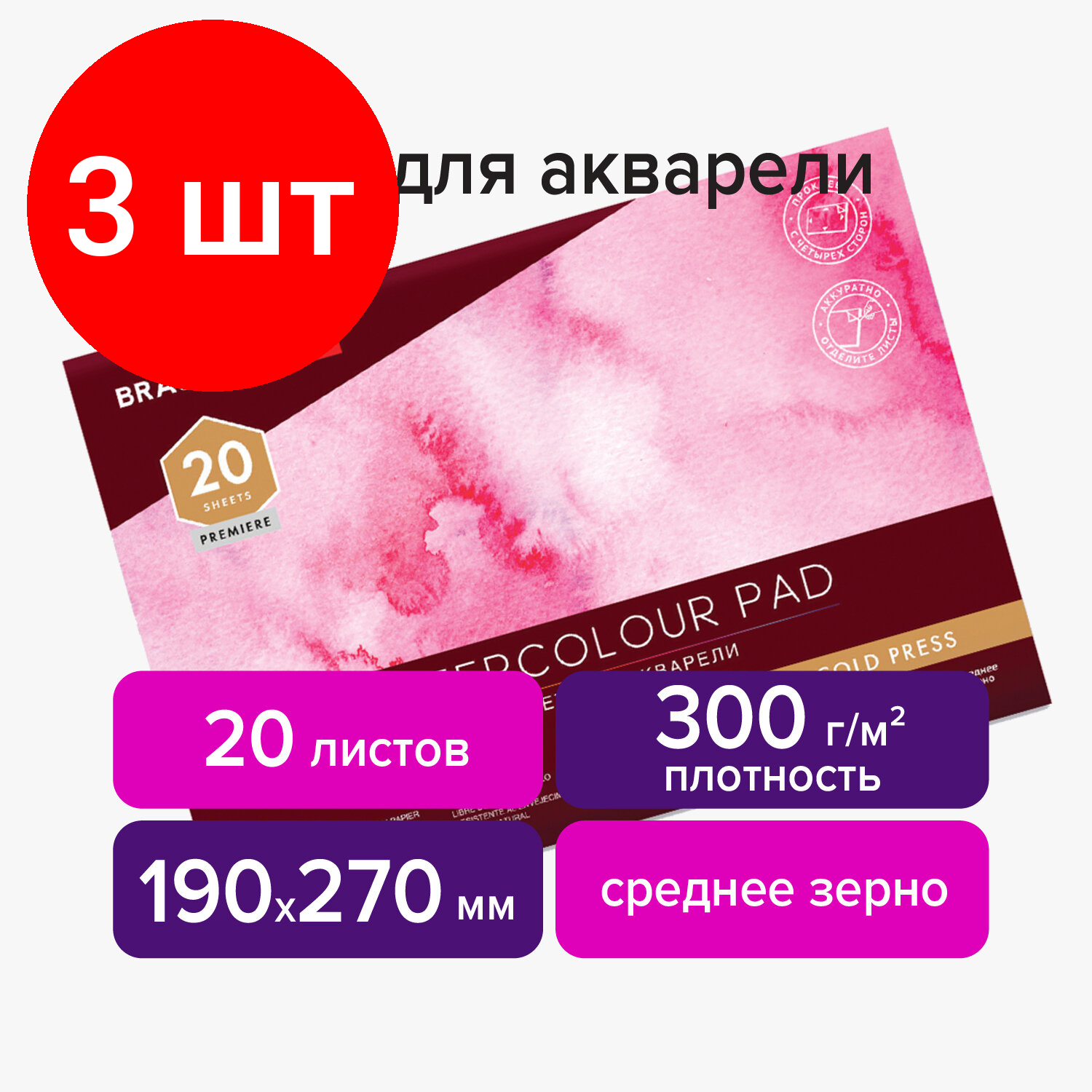 Купить Комплект 3 шт, Планшет для акварели хлопок 30% 300г 190х270мм склейка 4 стороны ср. зерно, 20л, BRAUBERG ART, 113251