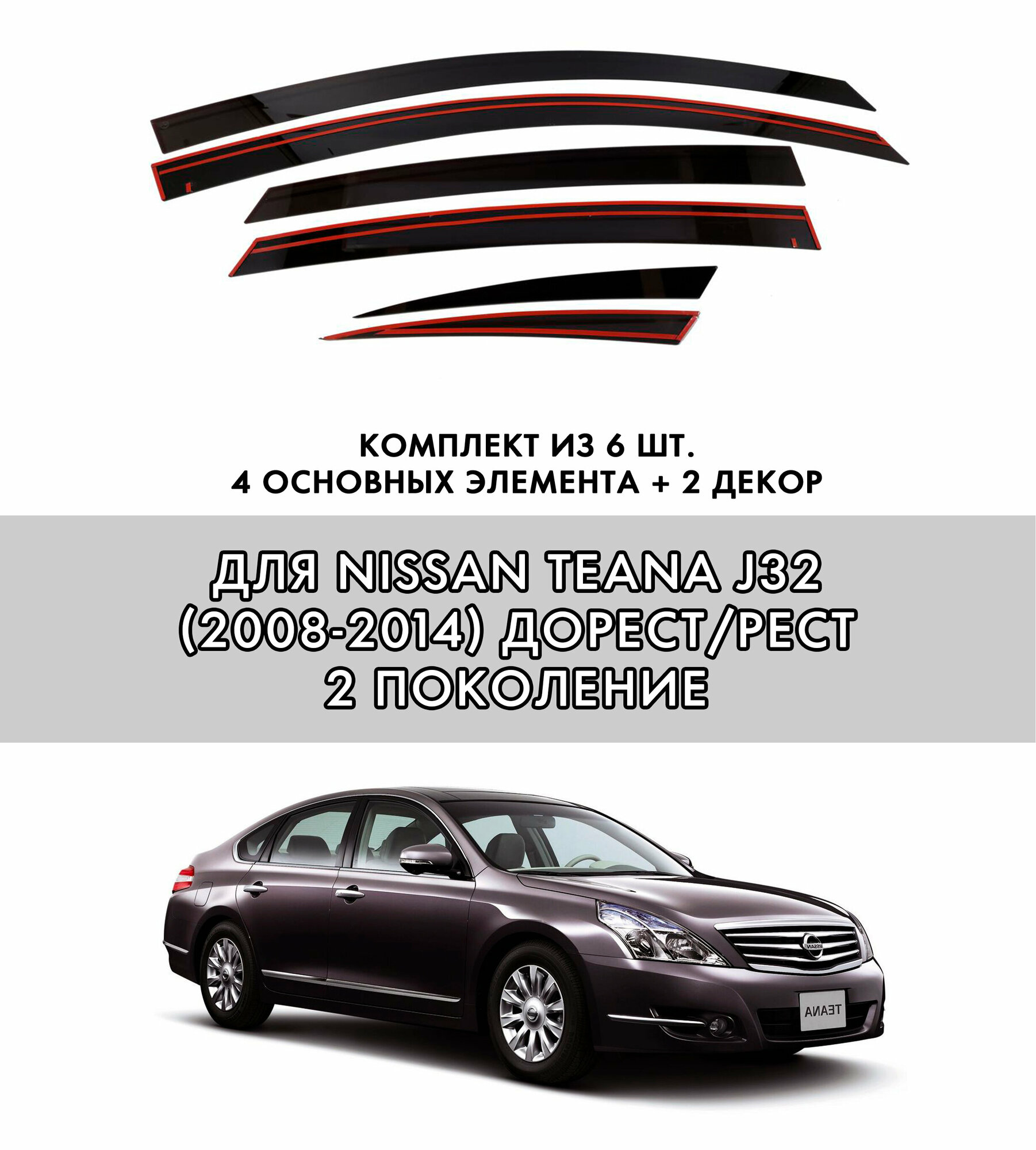 Плоские тюнинг дефлекторы для окон Nissan Teana J32 (2008-2014) / Ветровики 2d дефлекторы для окон Ниссан Тиана 2 поколение. Комплект 6 шт. интересное: