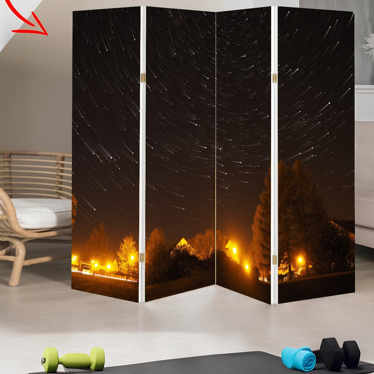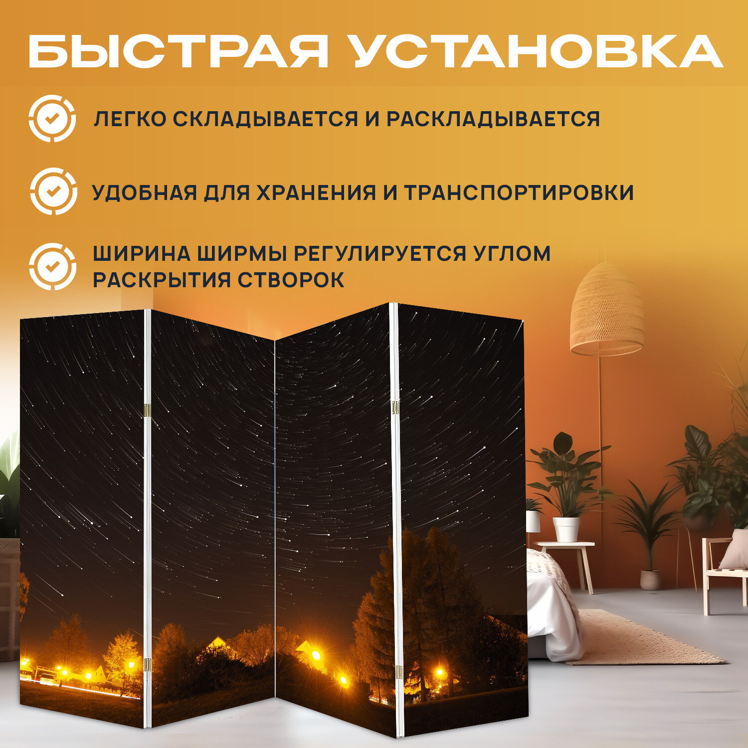 Ширма перегородка с принтом "Звезды, ночь, свет" на холсте - 200x160 см. для зонирования, раскладная интересное: