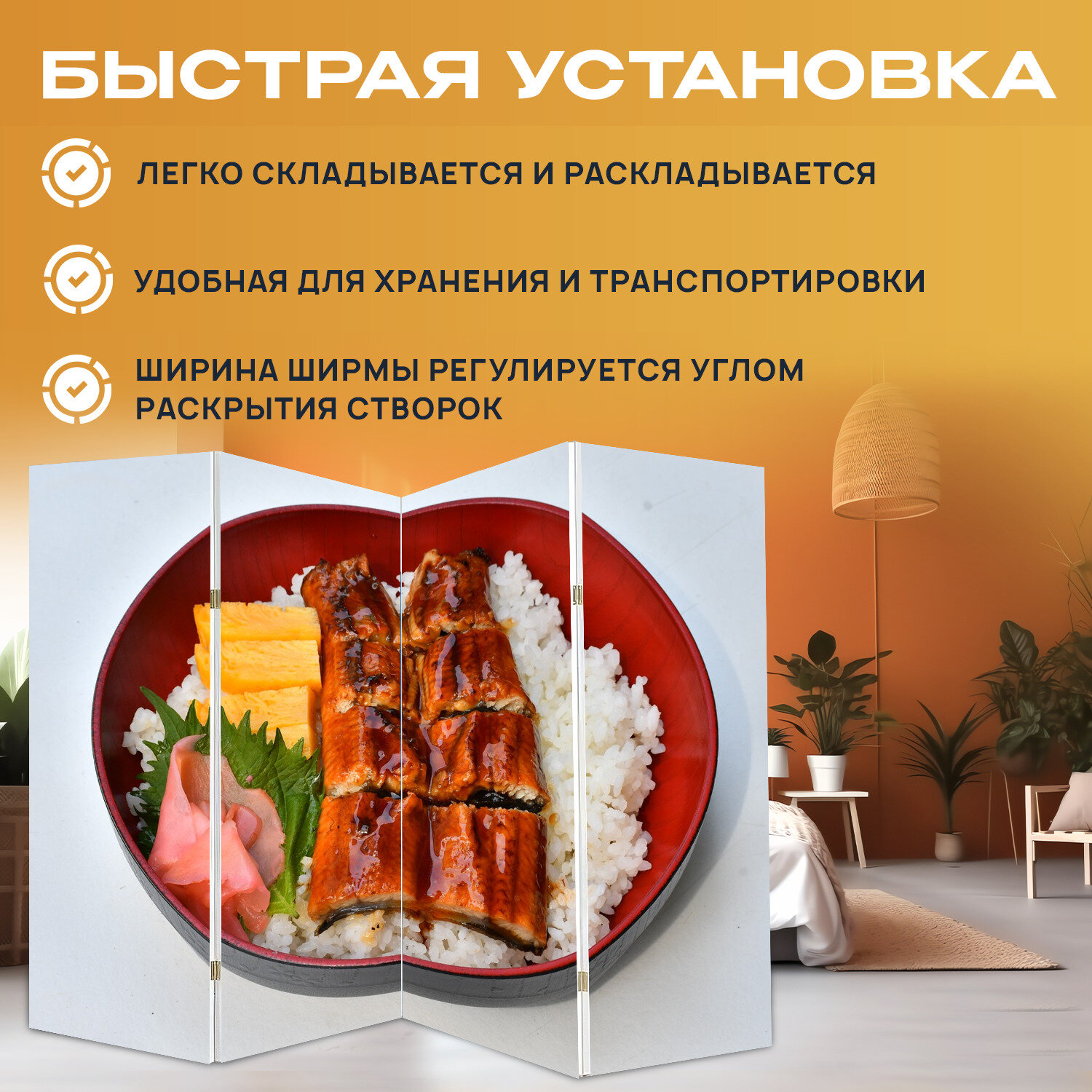 Купить Ширма перегородка с принтом "Еда, японская еда, рис" на холсте - 200x160 см. для зонирования, раскладная