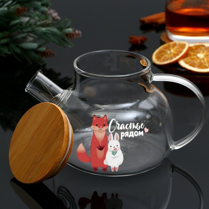 Чайник стеклянный заварочный с бамбуковой крышкой «Счастье рядом», 800 мл