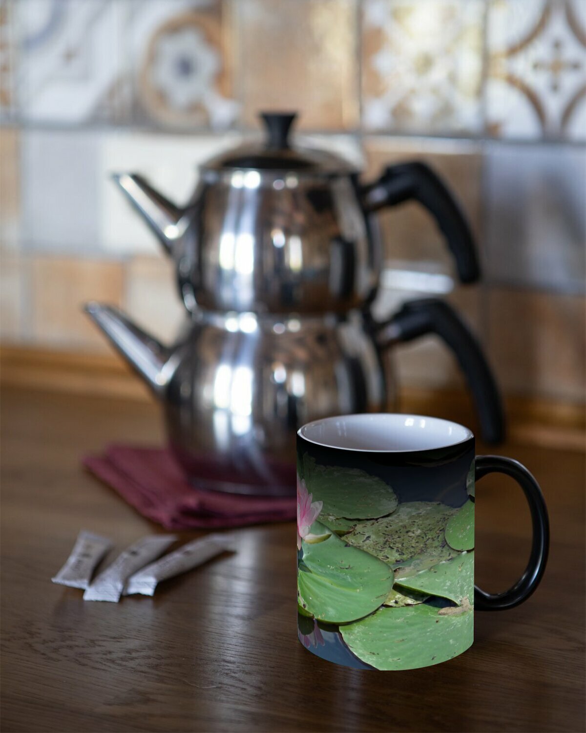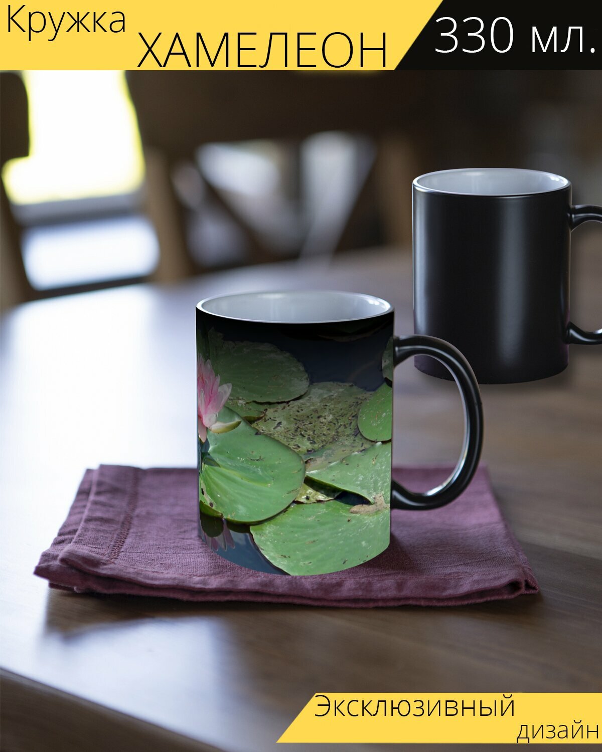 Кружка хамелеон с принтом "Водяные лилии, соединение, цветы" 330 мл. интересное: